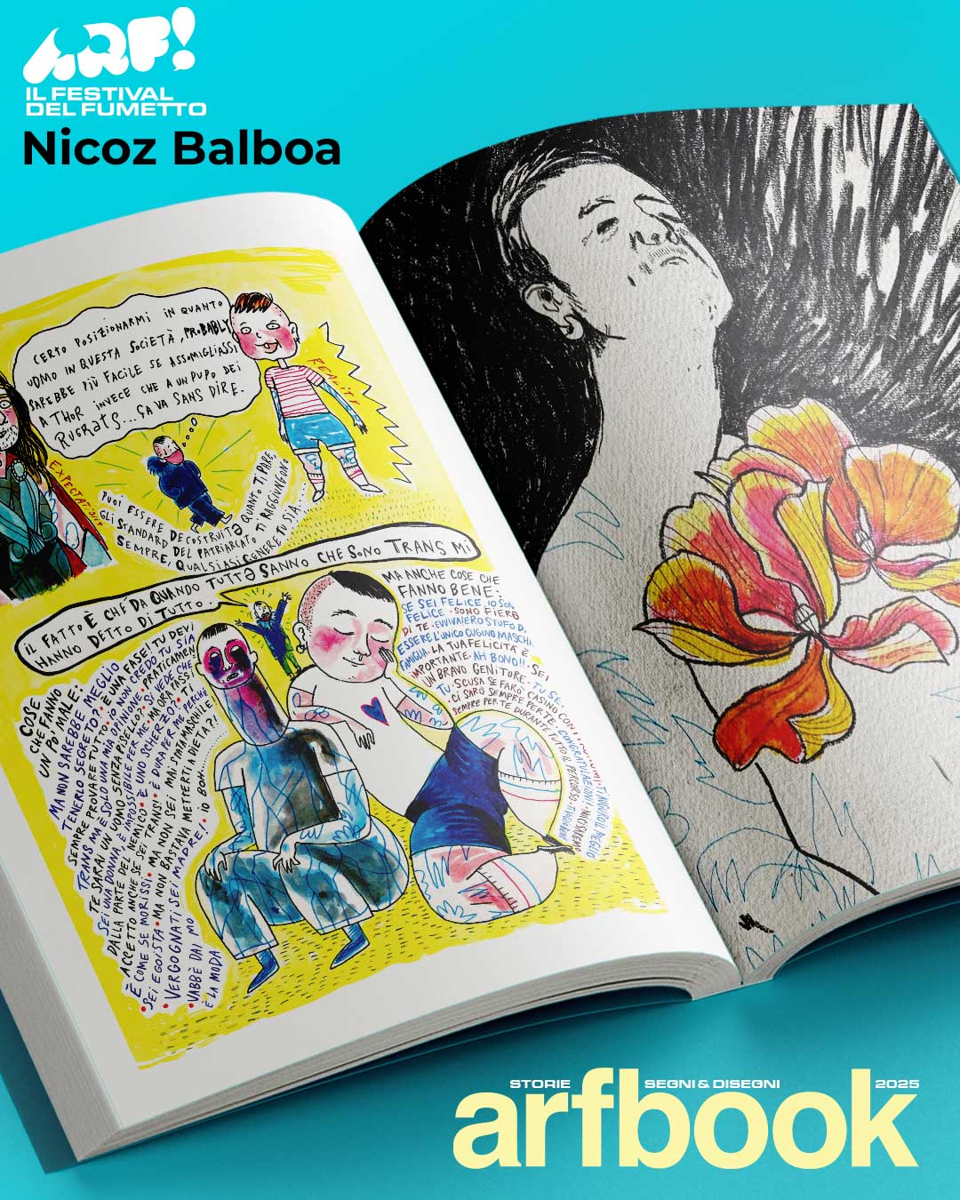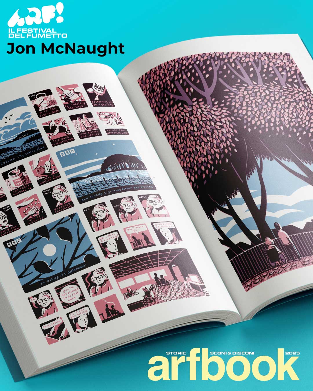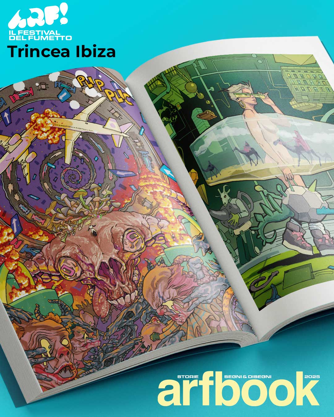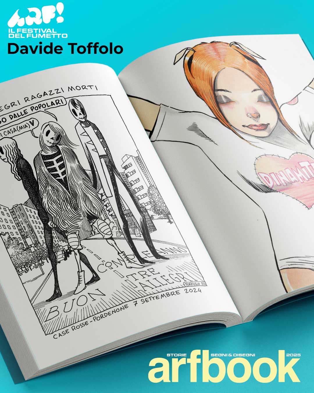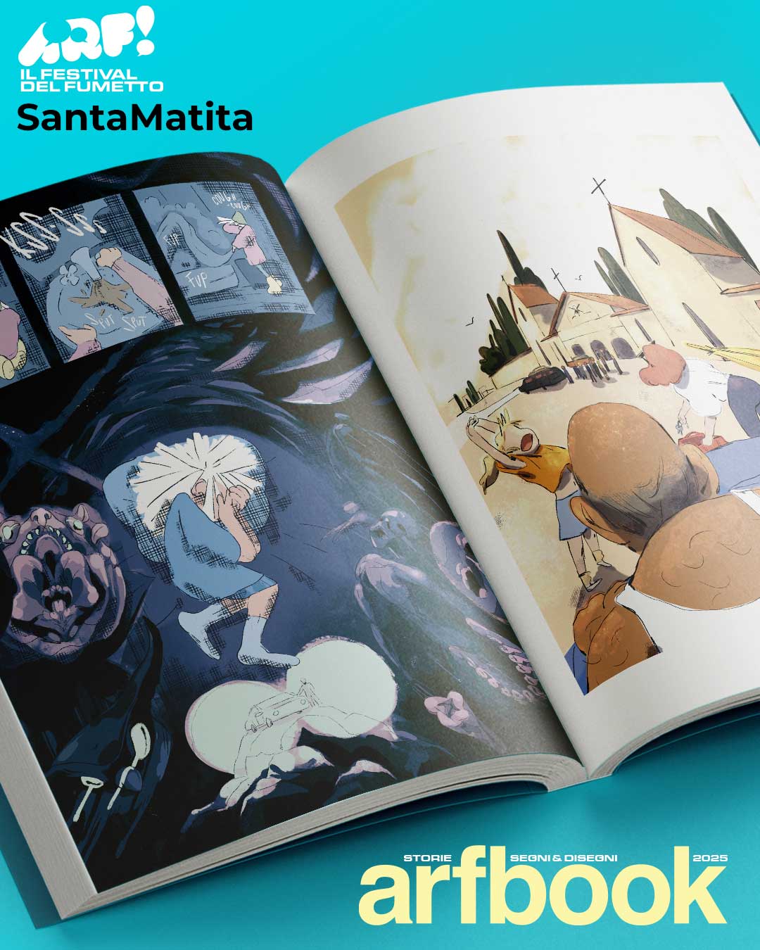 180 pagine a colori 🔥 con le tavole in mostra di Davide Toffolo · Jon McNaught · Tony Sandoval · Belén Ortega · Mirka Andolfo · Nicoz Balboa · SantaMatita · Trincea Ibiza, introdotte da contributi d’eccezione.
