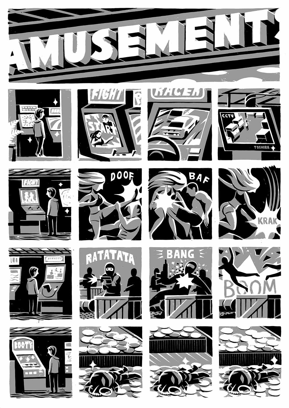 L’esposizione alla Pelanda del Mattatoio presenterà una ricca selezione di layout a matita, inchiostri, serigrafie, lucidi e tavole originali che – partendo da Birchfield Close e Pebble Island – ci guideranno attraverso il suo percorso fino a Dockwood (2012), Kingdom (pubblicato nel 2018 in UK per Nobrow e nel 2020 in Francia per Dargaud) e il nuovissimo Hors Scène, pubblicato da Dargaud lo scorso gennaio in occasione della 52ª edizione del Festival di Angoulême.