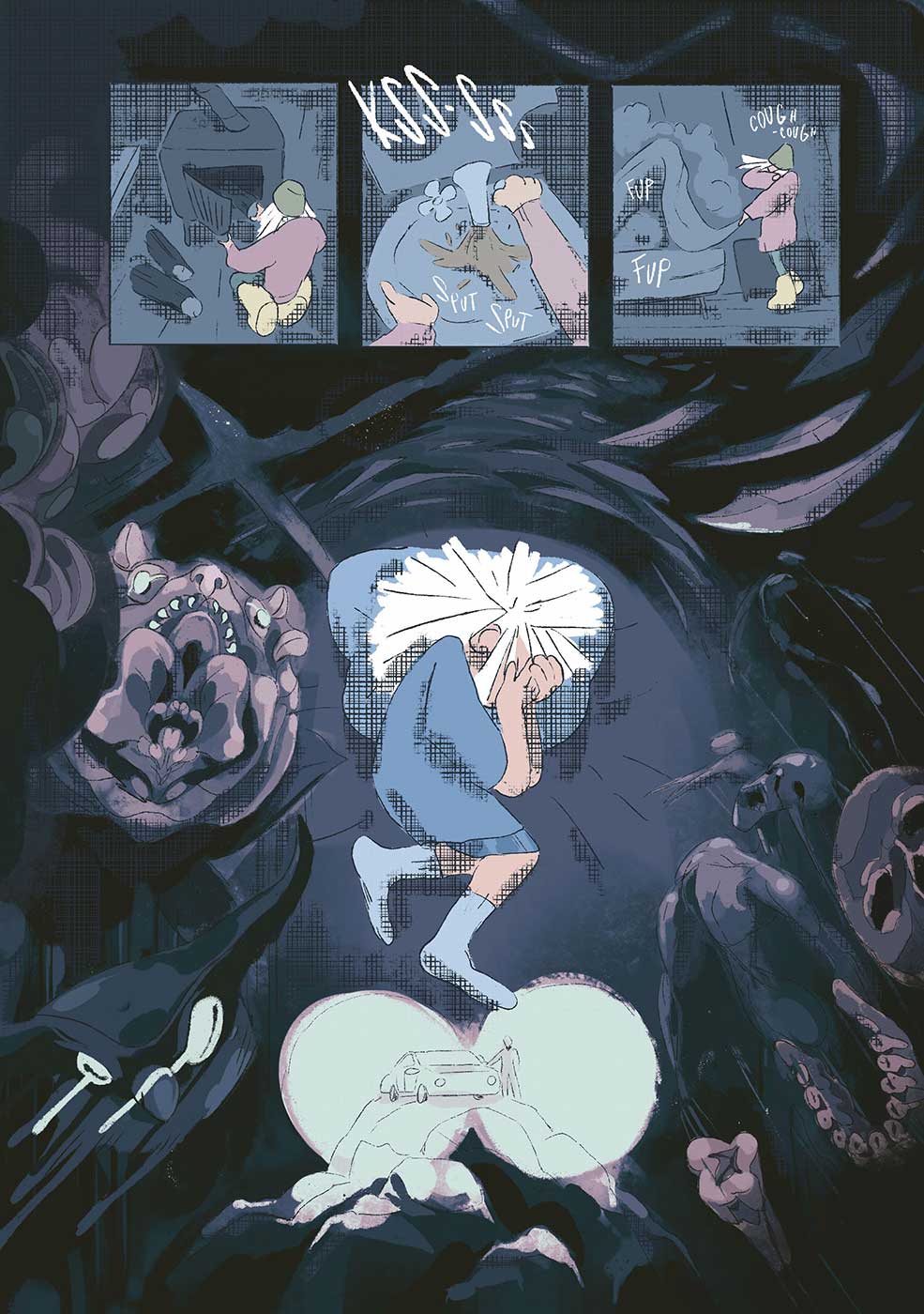 Silenzio, solitudine e un flusso di coscienza che si traducono nella rappresentazione a mano libera della scena recitata dagli attori che esistono nella sua testa. Pochi riferimenti e qualche coordinata. Il tutto prende forma dal nulla ed esiste in un luogo intangibile prima di trovarsi ad esistere su carta. Anche se oggi il processo è domato e organizzato in modo da poterlo rendere una professione, la scintilla che avvia il motore è sempre la stessa: fiducia nelle mani, nei mezzi e desiderio di scavare dentro di sé oltre ad esplorare intorno.»
