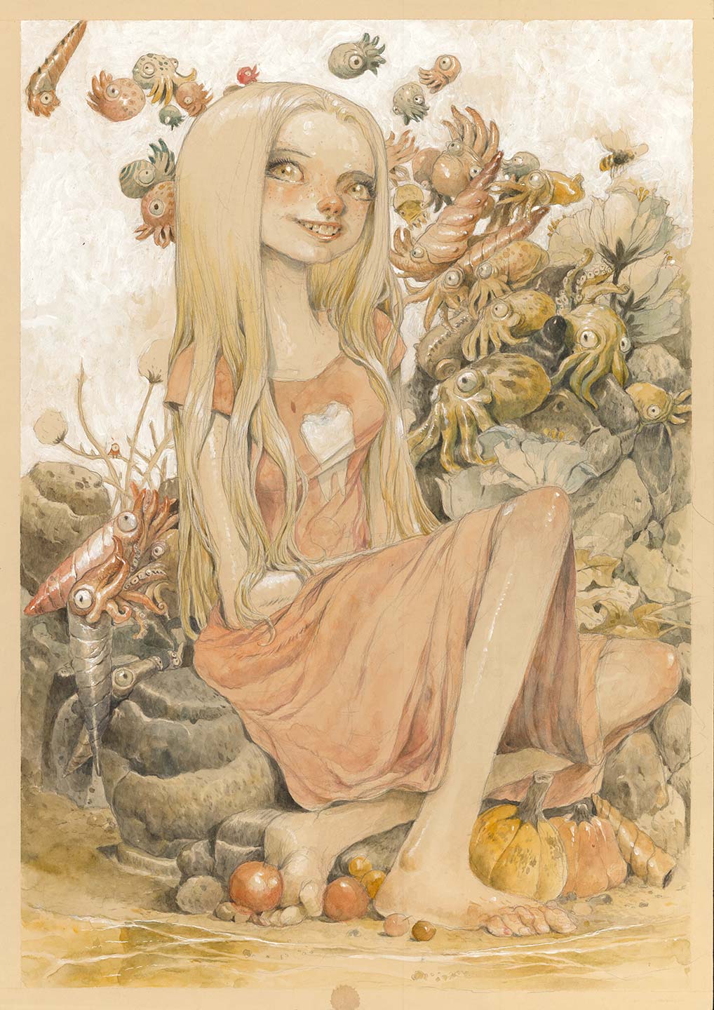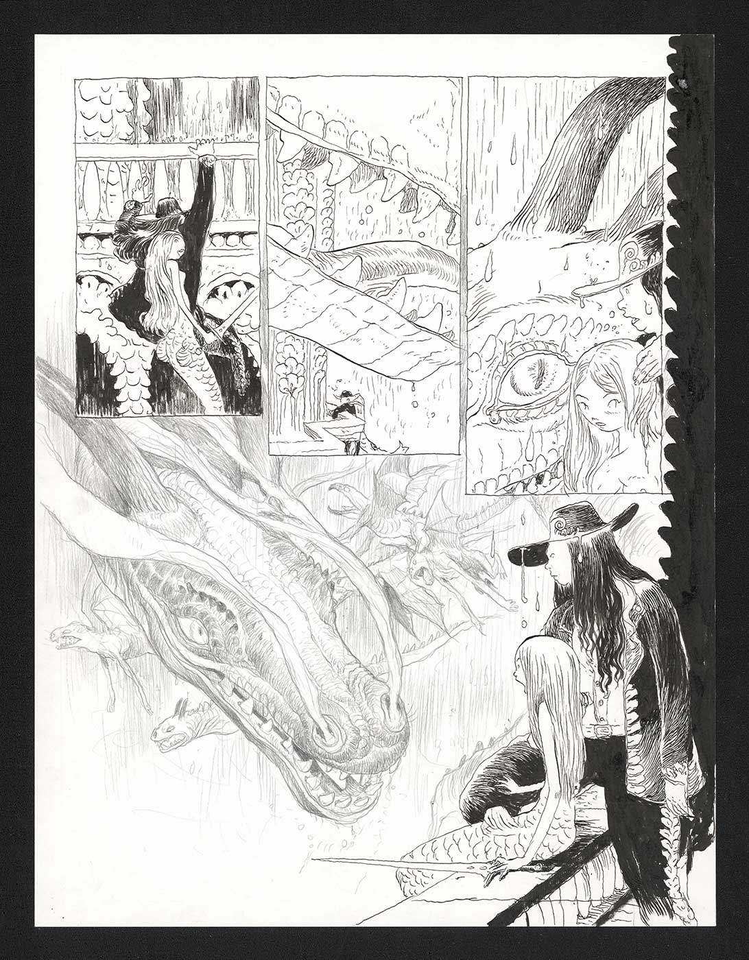 Un percorso espositivo curato con attenzione che ripercorre le tappe più significative della sua produzione artistica: dagli acquerelli onirici di Watersnakes, alle chine intense di Doomboy e Mille Tempeste, passando per le mine di piombo de La città dei dragoni.